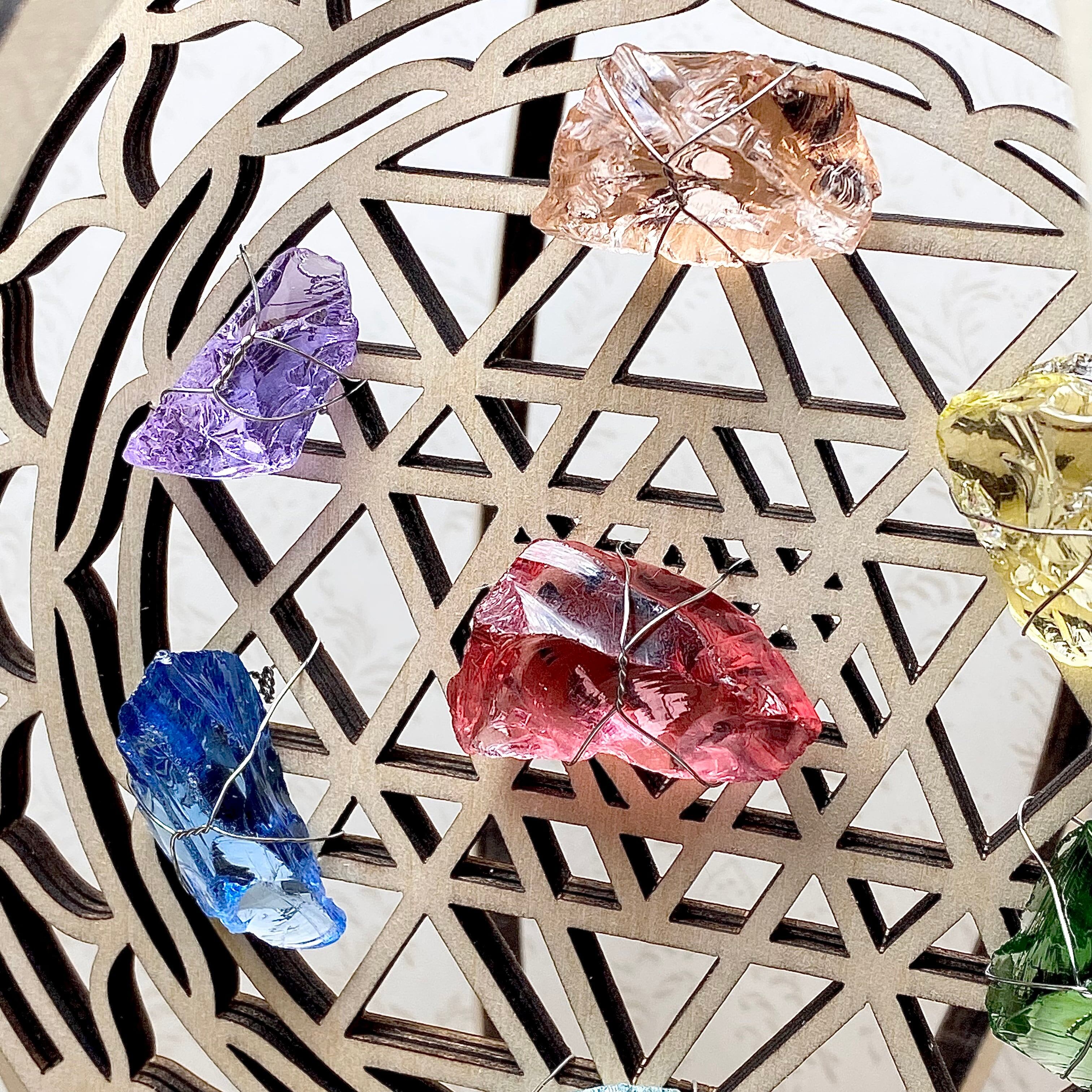 インドネシア産アンダラクリスタルちび原石のチャクラカラーを使った温もりを感じさせる木製モビールです。風でくるくる回るウッドスピナー。