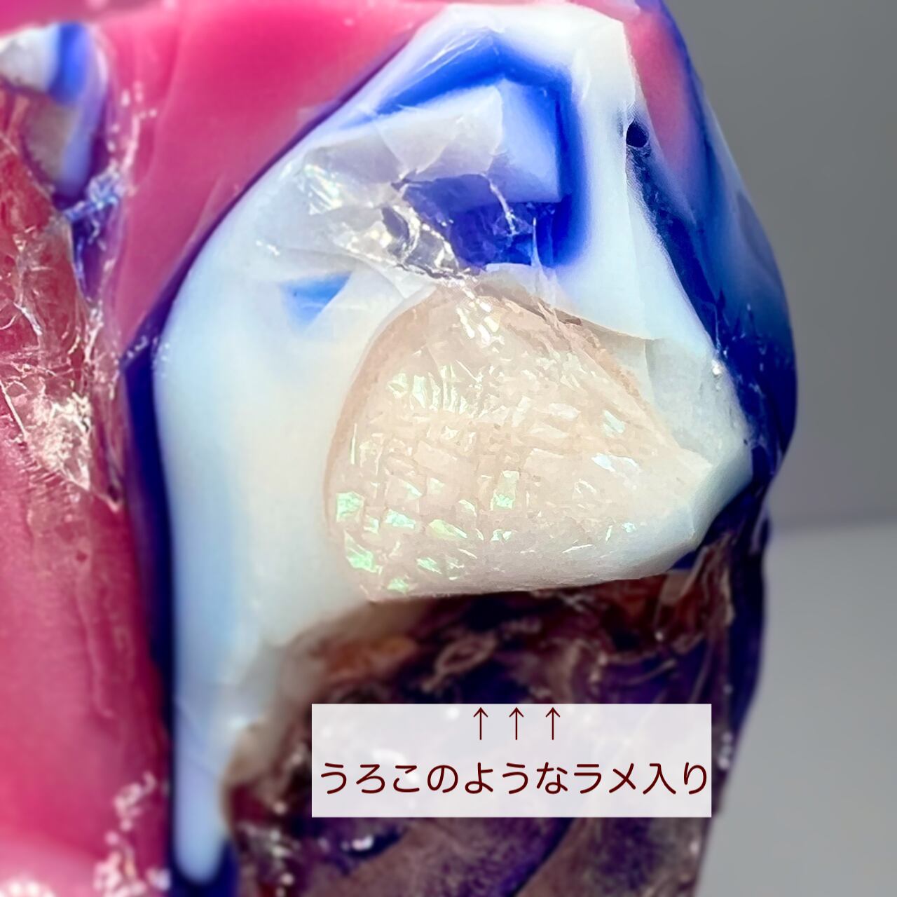 マットピンクとコバルトブルー、マットホワイトが重なり合い、所々にウロコのようなラメが輝いているのが《マーメイド ラヴァーズ》の特徴で、《ユニコーン ゴールデンライト》との違いです。