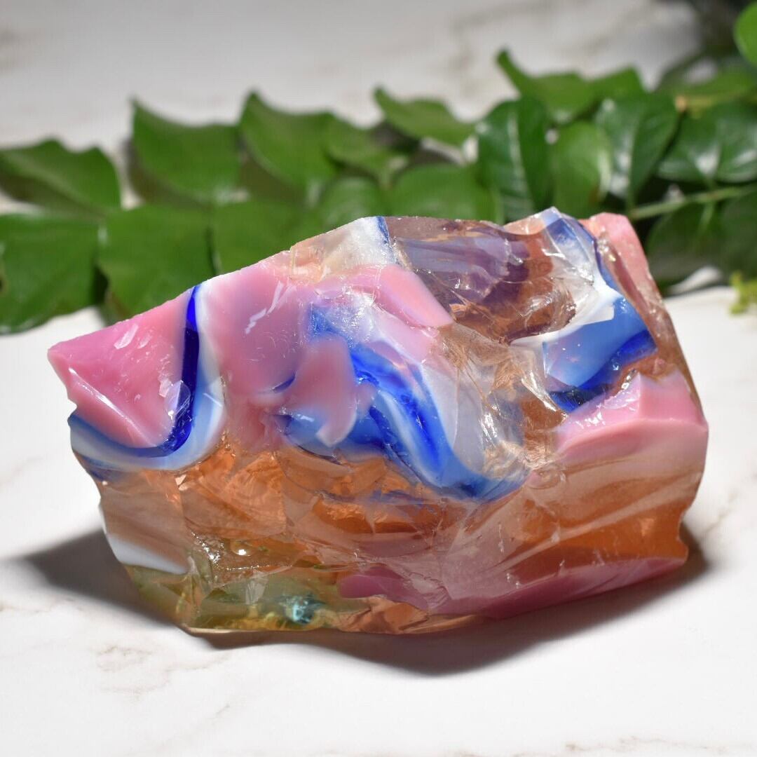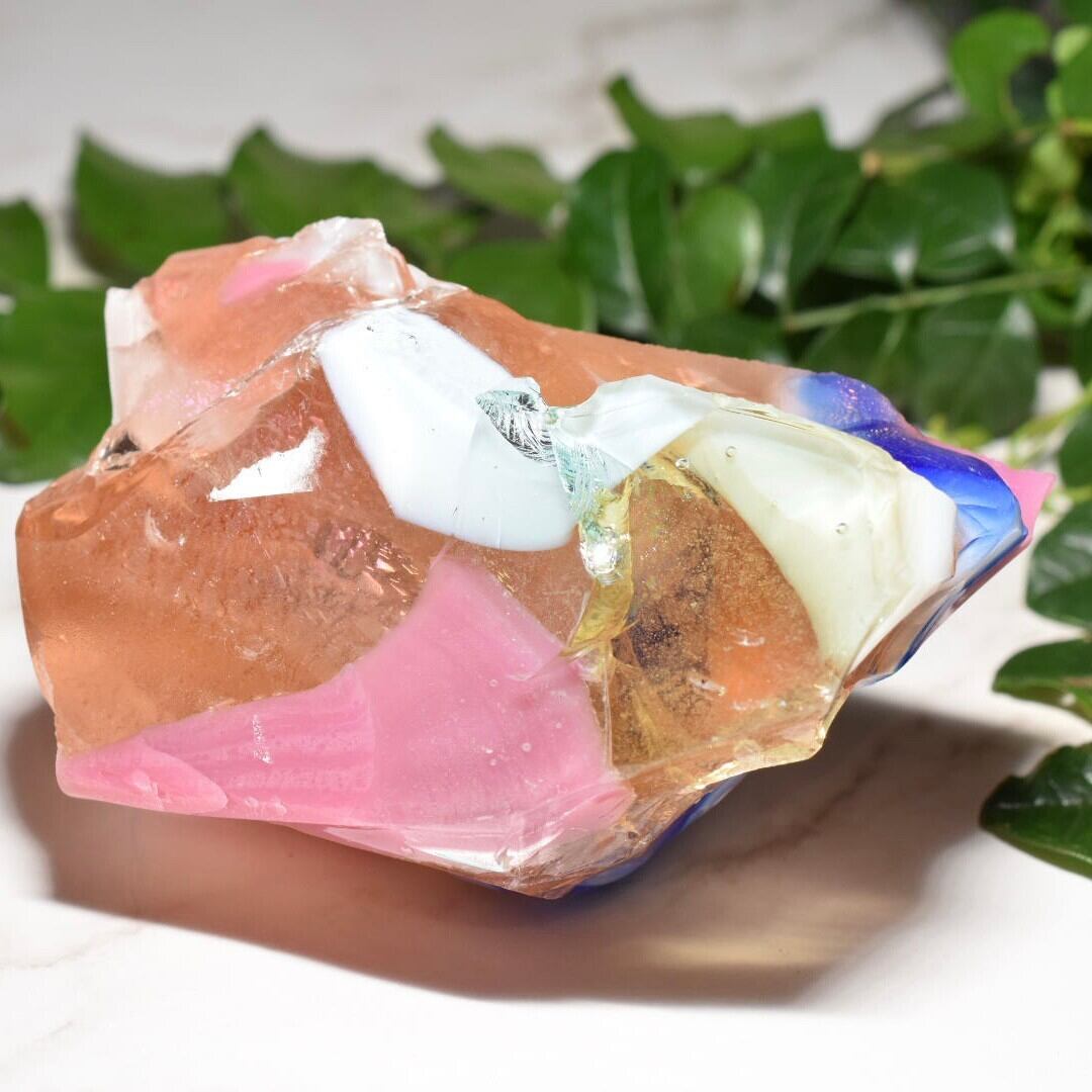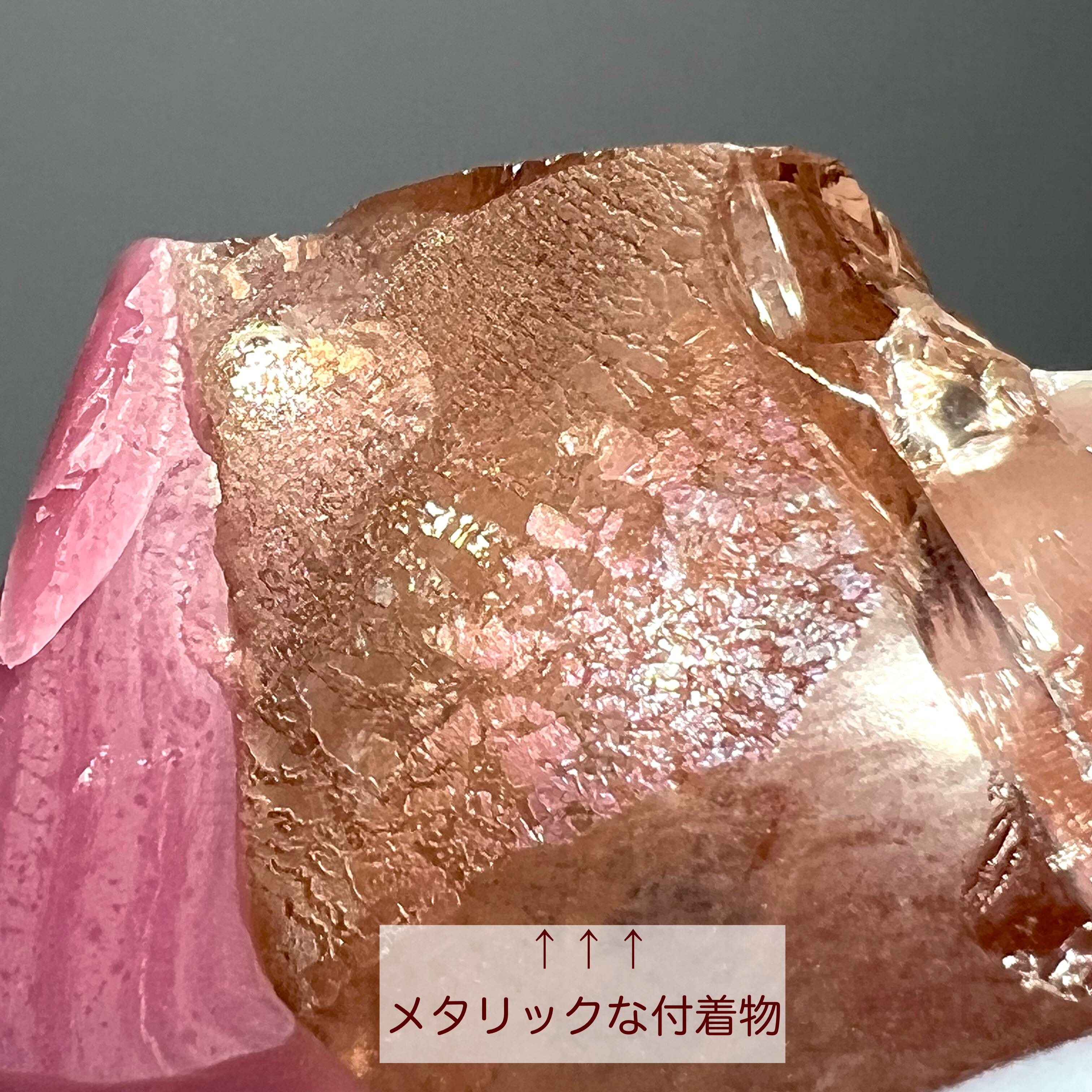 この子の特徴はメタリックな付着物が、7色と言うよりブルー~パープル~ピンクでより引き立てています。平らな面でザラザラとしている部分がありますので〈画像参照〉その場所を角度を変えながら光を当てますとメタリックカラーが見えてきます。