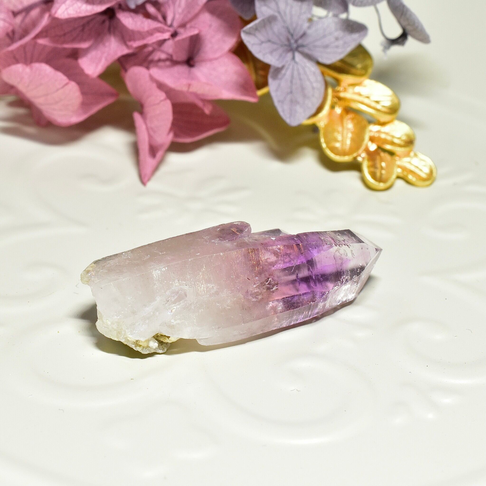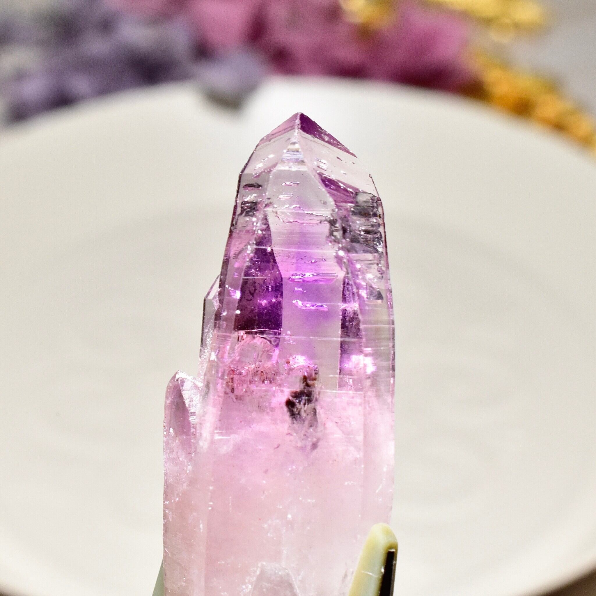 透明度の高い淡いラベンダーカラーと光沢のある細長い結晶が特徴で